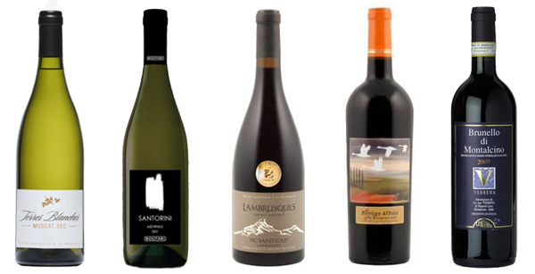 From left: Dante Robino Bonarda 2011, Domaine Des Amadieu Cuvée Vieilles Vignes Cairanne Côtes Du Rhône Villages 2011, Bodegas Olarra Anares Reserva 2006, Fantinel Sant’helena Pinot Grigio 2012, and Mike Weir Limited Edition Riesling 2012