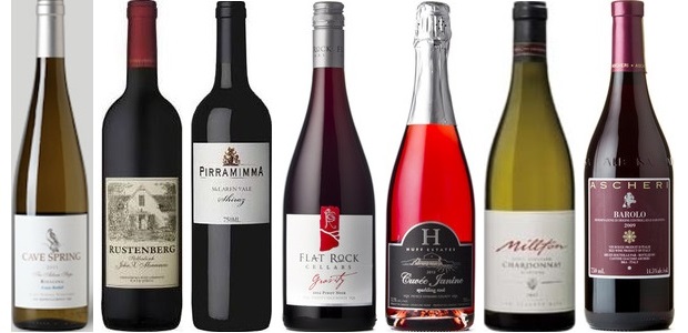 From left to right: Cave Spring Riesling ‘The Adam’s Steps’ 2013, Rustenberg John X Merriman 2011, Pirramimma Shiraz 2011, Flat Rock Gravity Pinot Noir 2012, Huff Estates Cuvée Janine 2012, Millton Opou Vineyard Chardonnay 2009, Ascheri Barolo 2010