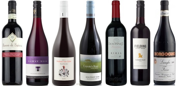 From left to right: Tenuta Le Velette Rosso di Spicca 2012, Tawse Gamay Noir 2013, Freiherr Von Göler Pinot Noir 2011, Coyote’s Run Pinot Noir 2013, Lealtanza Reserva 2009, Fielding Estate Cabernet Franc 2012 and Borgogno Langhe Freisa 2012