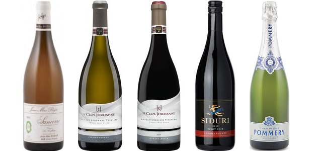 From left to right: Jean Max Roger Cuvée Les Caillottes Sancerre 2012, Le Clos Jordanne Chardonnay Le Clos Jordanne Vineyard 2011, Le Clos Jordanne Pinot Noir Le Clos Jordanne Vineyard 2011, Siduri Sonoma Coast Pinot Noir 2012, Pommery Brut Silver Champagne