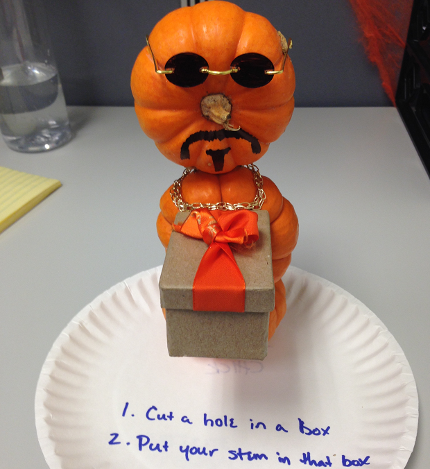 In 2013, the top answer on the board was “nothing like a glass of wine on Halloween puts you in the mood to have another glass of wine on Halloween.” This guy may have had one too many while designing pumpkins. His ‘Stem In A Box’ is nothing if not creative. The phrasing may be indelicate but its meaning is clear.