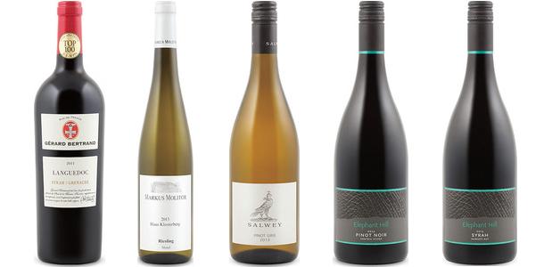 From left to right: Gérard Bertrand Languedoc Syrah/Grenache 2011, Markus Molitor Haus Klosterberg Riesling 2013, Salwey Pinot Gris 2013, Elephant Hill Pinot Noir 2013 and Elephant Hill Syrah 2012