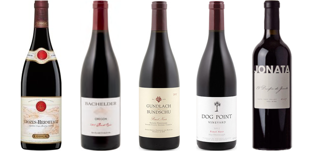 From left to right: E. Guigal Crozes Hermitage 2011, Bachelder Wines Pinot Noir Oregon 2012, Gundlach Bundschu Estate Pinot Noir 2012, Dog Point Pinot Noir 2012 and Jonata Tierra 2008