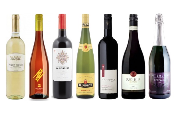 From left to right: San Raffaele Monte Tabor Pinot Grigio 2014, Dirty Laundry Gewurztraminer Madames 2013, Palacios Remondo La Montesa 2012, Trimbach Riesling 2012, Southbrook Triomphe Cabernet Franc 2013, and Red Hill Estate Pinot Noir 2013 and Hinterland Borealis Method Charmat Rosé 2014