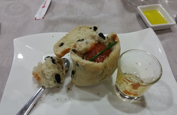 As we did each night previous to five D.O. visits around Aragon, we tasted the following day’s wines while at dinner in Zaragoza. Somontano accompanied Josechu Corella’s Michelen star Bal D’Onsera. Chef Corella’s cuisine is distinctly Aragonese adscititious of quality sea ingredients, to balance out any possible meat overkill on the heels of a Zaragoza week in celebration of the festival of the Pilar. Gastronomy harmonized, magnetized and gathered automatically for the people. Chef’s plates and bowls aligned, as if by invisible connections, to protein, from produce and by molecular touch, in textured attraction, together, without fail. Eleven courses of plentiful exigency chaperoned by the discreet and propitious staff. This amuse bouche was not one of the expected 10.