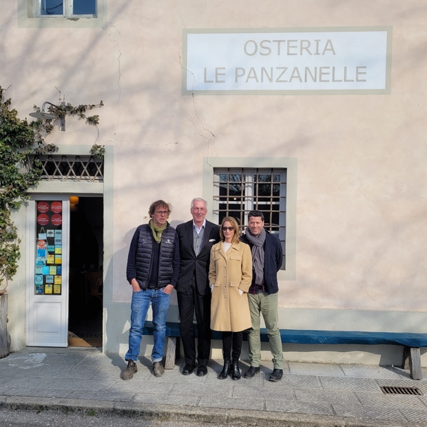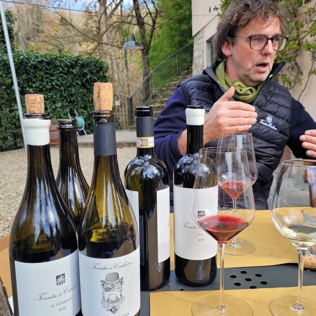 Let us back track for just a couple of paragraph’s moment. Travelling companion, beautiful friend, articulate writer and persuasive speaker Michaela Morris and I are having lunch with Il Guercio, the one and the only Sean O’Callaghan at Osteria Le Panzanelle in Lucarelli, Radda in Chianti. It’s the first truly warm day of March and so Nada Michelassi creates a table for us on the terrace. Sean hails from the U.K. and is asked to peek indoors on a distinguished and clearly famous solo British diner but he returns after not immediately recognizing the man. A moment later, as if having silently swept in like an apparition, he’s standing over our table. “May I join you?” he inquires, a chair is pulled up, a glass of Tenuta di Carleone is poured and introductions are made.