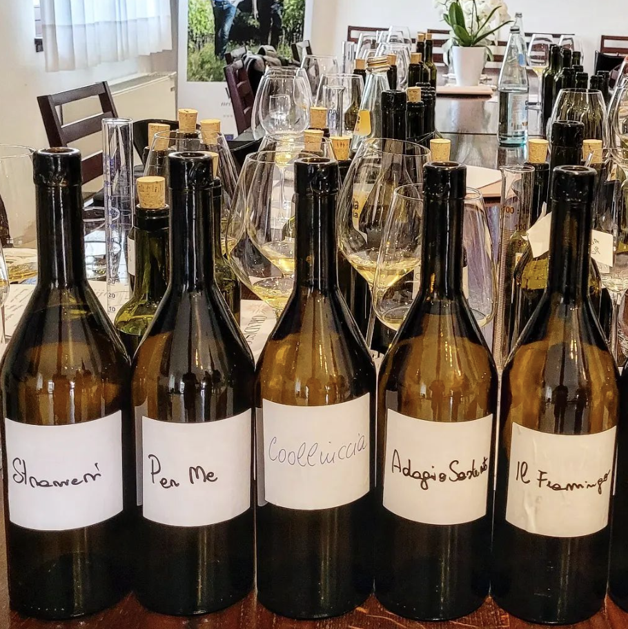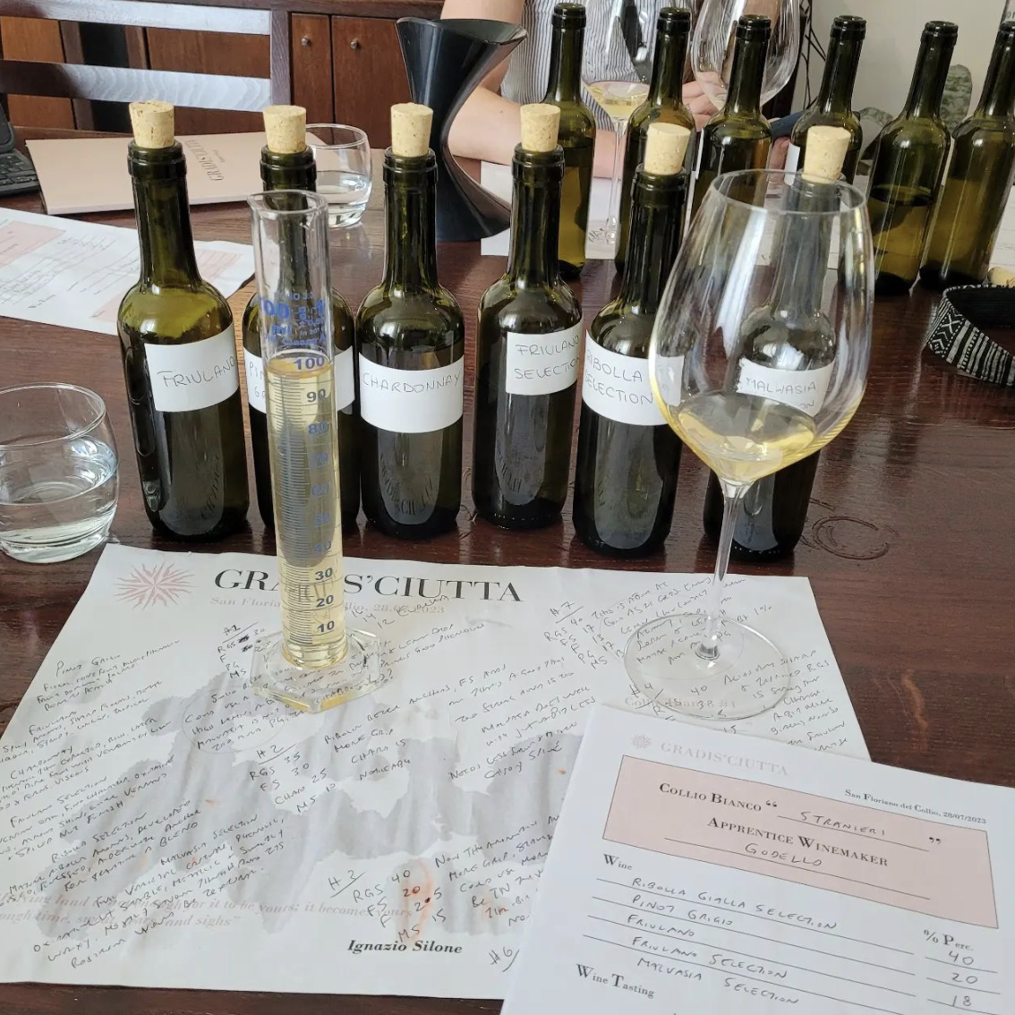 The Collio Bianco is surely the place where each producer finds its artistic and territorial expression, but it also determines their expertise at blending. At Gradis’ciutta in San Floriano del Collio we practiced as “Apprentice Winemakers” for a morning and made our own Collio Bianco blends. Godello’s was coined “Stranieri” for obvious reasons, number one being that he was an interloper in this Collio Bianco game. His blend was led by ribolla gialla at 40 percent, followed by friulano (30), pinot grigio (18) and finally malvasia (12). It seems his concep[tualiztion differed greatly than that of the Gradis’ciutta 2022 Collio Bianco. Their’s was based on pinot grigio, chardonnay and sauvignon with some riesling and so the indigenous varieties like ribolla gialla and friulano are neither anchors nor supporting cast members. Other grapes allowed from those grown on the estate can be müller thurgau, picolit, riesling italico, riesling and traminer aromatico. The first and last of those cannot exceed a total of 15 percent of the blend.