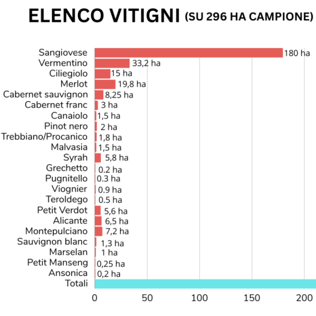 - Montecucco’s 300 working hectares are comprised of seven municipalities; Cinigiano, Castel del Piano, Seggiano, Civitella Paganico, Campagnatico, Arcidosso and Roccalbegna. Within these comuni the recent survey’s analysis showed 243.39 hectares with the potential to produce wines that can be labeled Montecucco DOC (of both Rosso and Vermentino), while 197.42 hectares hold the potential for the production of Monteccucco Sangiovese DOCG.