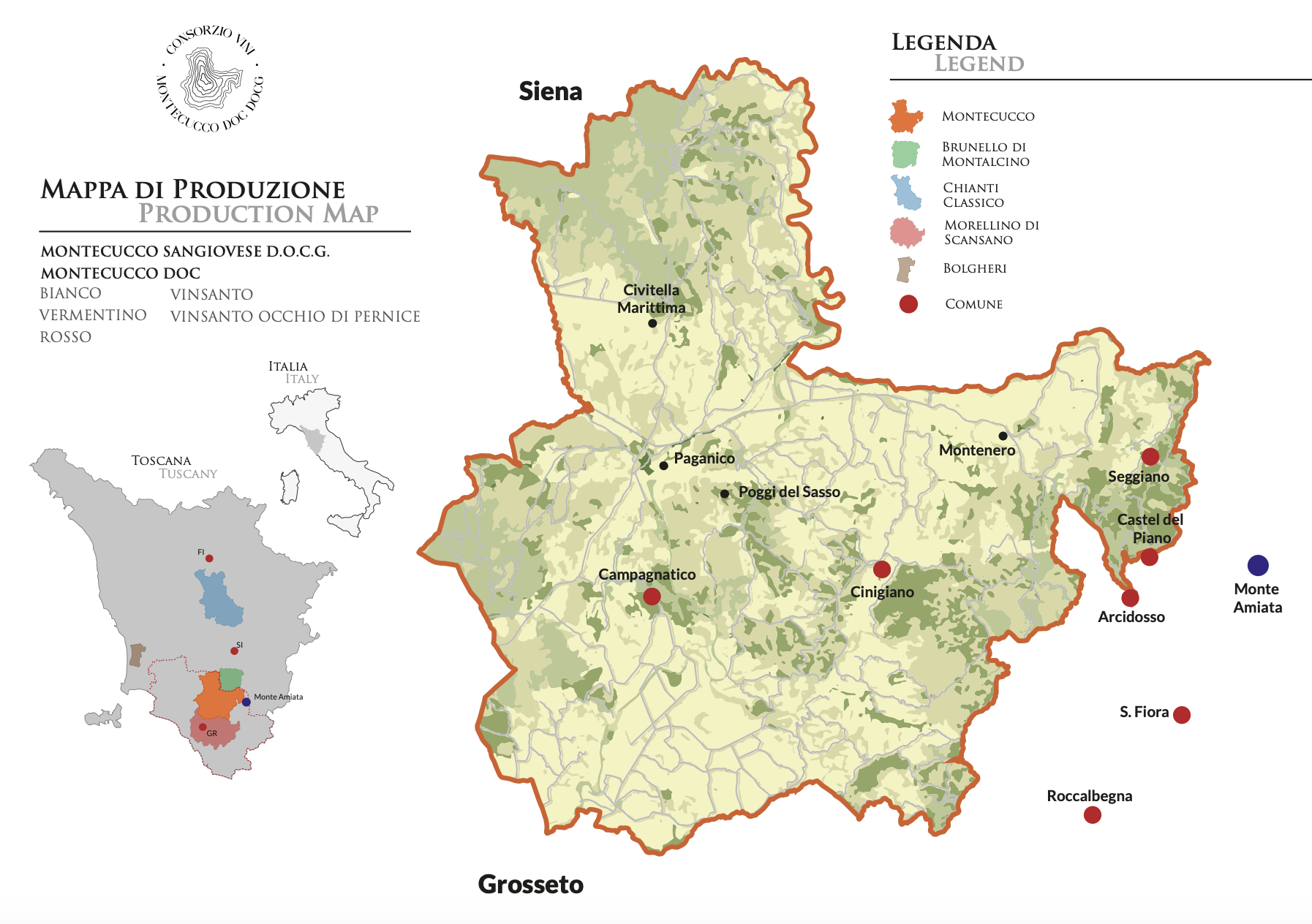 - The Montecucco territory in southwestern Tuscany’s Grosseto Province is located between the hills overlooking Monte Amiata and on the other the Maremma valleys. To the south is Morellino di Scansano and across the Ombrone River there is Montalcino. The region shares a small amount of vineyard hectarage with Maremma which primarily lies to the west in the direction of the Tuscan coast. Montecucco vineyards are found in three distinct areas: To the north on the flats by the Ombrone, up on a plateau with Cinigiano at its heart and in the east up on the foothills of Monte Amiata.