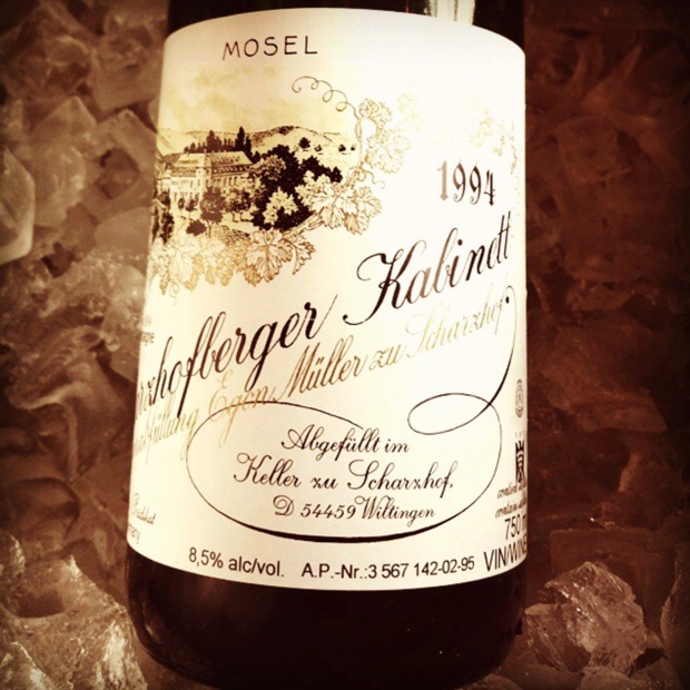 It must first be said that after 90 minutes in the glass the orange blossoms open in the early morning to release their spring fragrance into the room. In a conference room at Toronto’s Four Seasons Hotel. Now I don’t really know if the Scharzhofberg vineyard was actually planted by the Romans or if it was occupied by eighth century Trier St Marien ad Martyres monks. If following the French Revolution it was in the possession of the Duchy of Luxembourg I couldn’t say. I can equivocate, with irrefutable conviction that tasting Egon Müller’s 1994 twenty one years after its release confirms the vineyard’s reputation for housing irreverent Riesling. The arcade fire of remarkable hue, life-affirming aromatic energy and sky-lift brilliance is palpable. At 20 plus years the ideology, eventuality and passionate progression of purely distilled Mosel fruit is realized. Currently suspended in jet-trail animation, the sugars over gas of this Kabinett are quantitatively resilient. The relationship has seen a symbiotic feeding for longevity. Riesling of stoicism, classic prevalence and perfect balance. The specific Scharzhofberg tang has been revised to elevate a new order derivative recorded in every pure note. “There’s a weight that’s pressing down, late at night you can hear the sound.” Time held will move forward ever so slowly. Keep the car running. Drink 2015-2034.  Tasted April 2015    @germanwineca