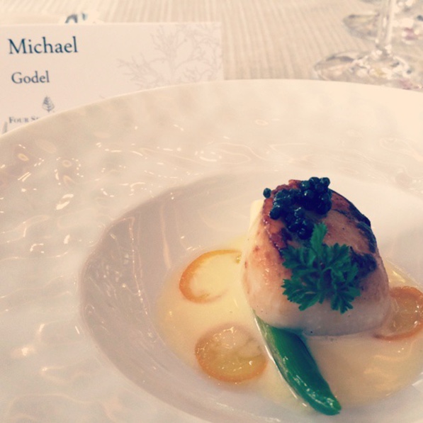 Scallop, kumquat, baby leek, caviar #fourseasonstoronto #julienlaffargue #primumfamiliaevini with #drouhin #chablis grand cru les clos 2012 and #egonmuller #riesling #scharzhofberger kabinett 1994